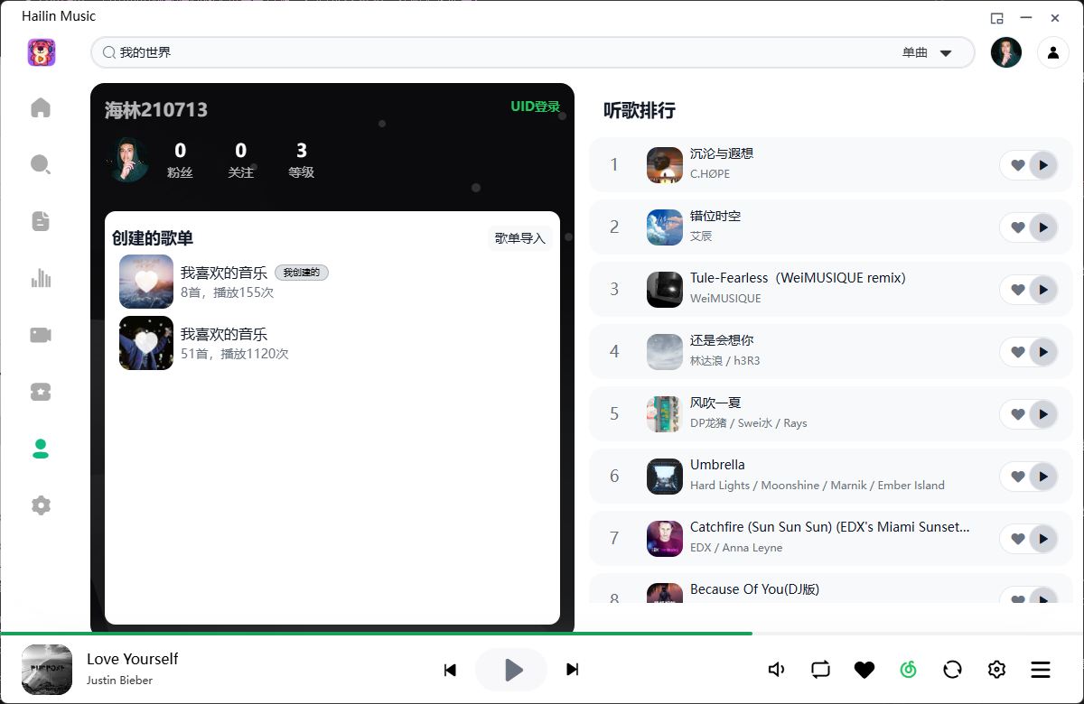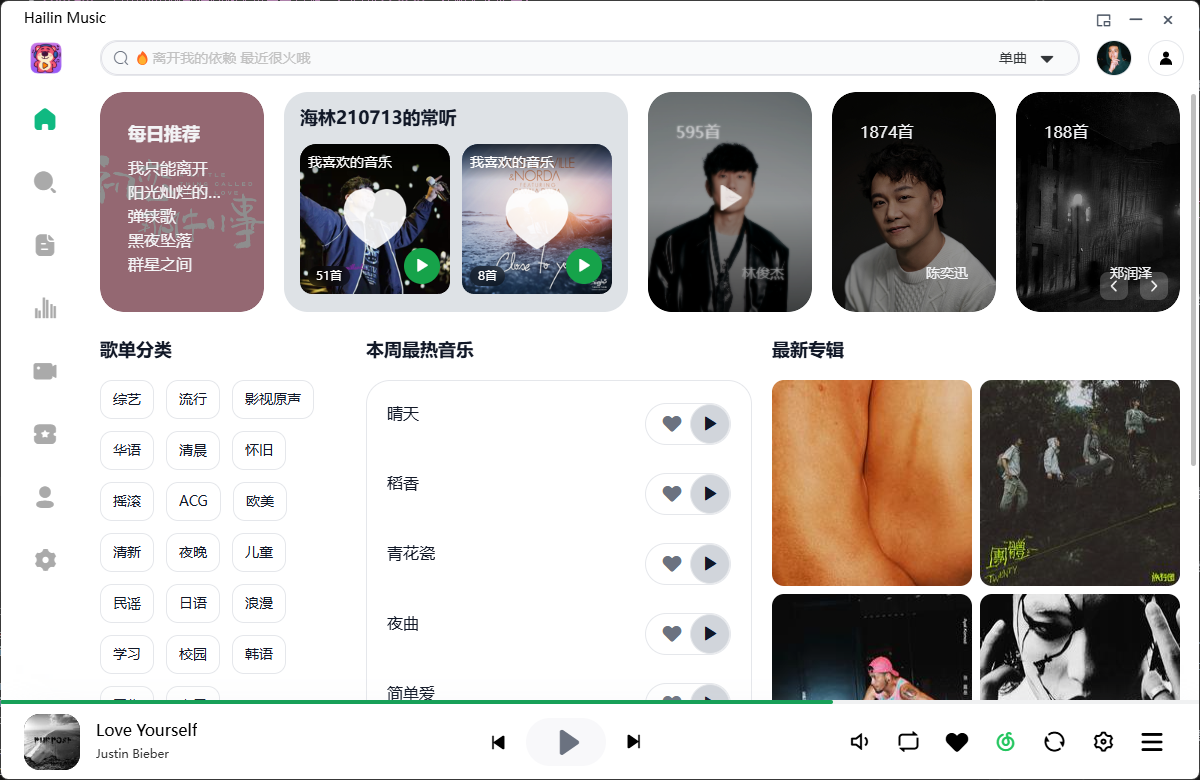 Hailin音乐播放器仅供个人学习使用,目前之开发了桌面端,邀请码为VIP001,移动端得过段时间,感兴趣的小伙伴可以在我的私人网盘->海林小喷壶中下载。
